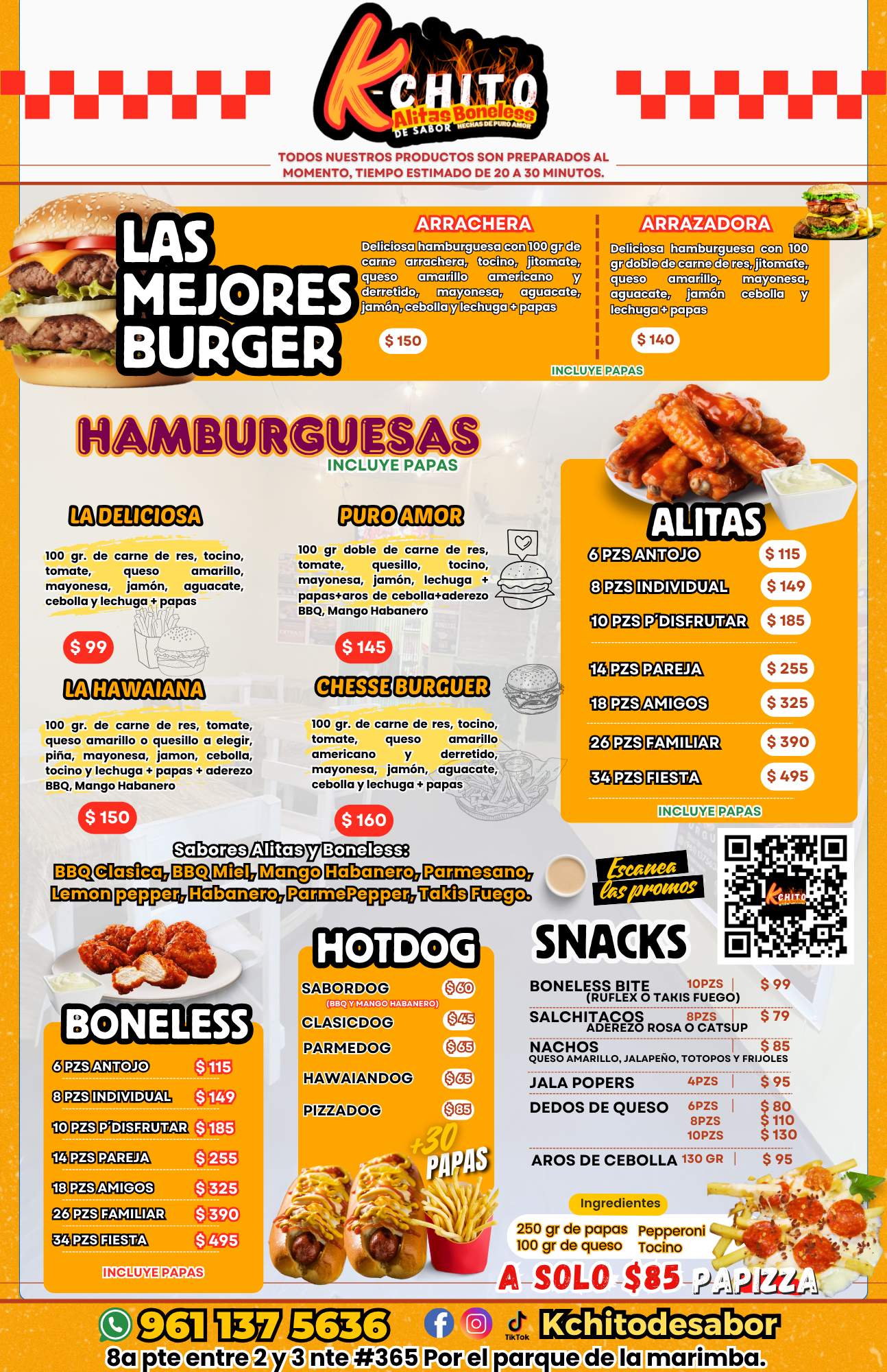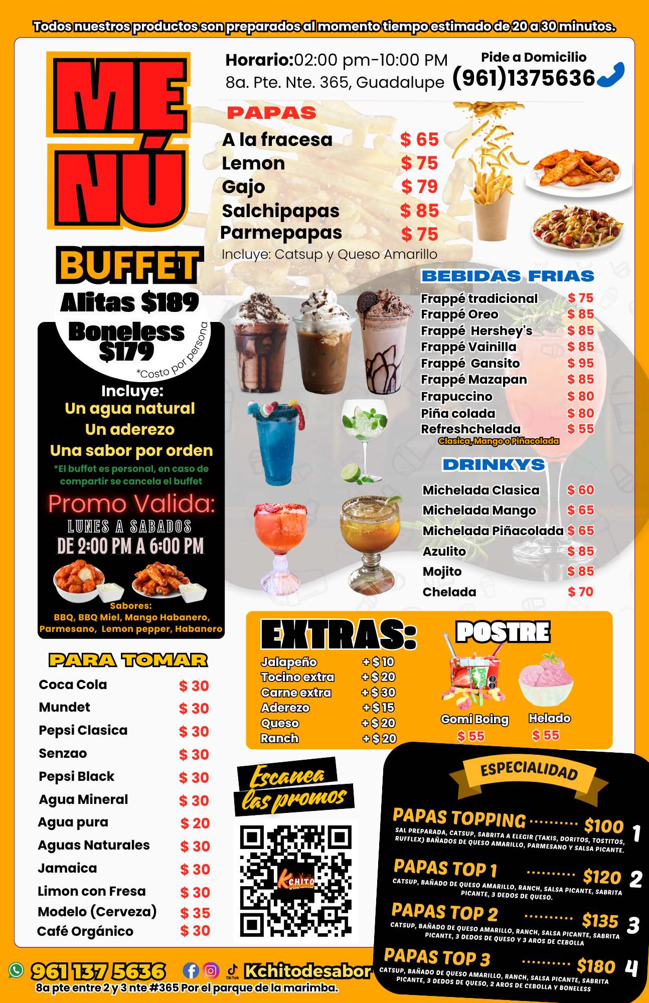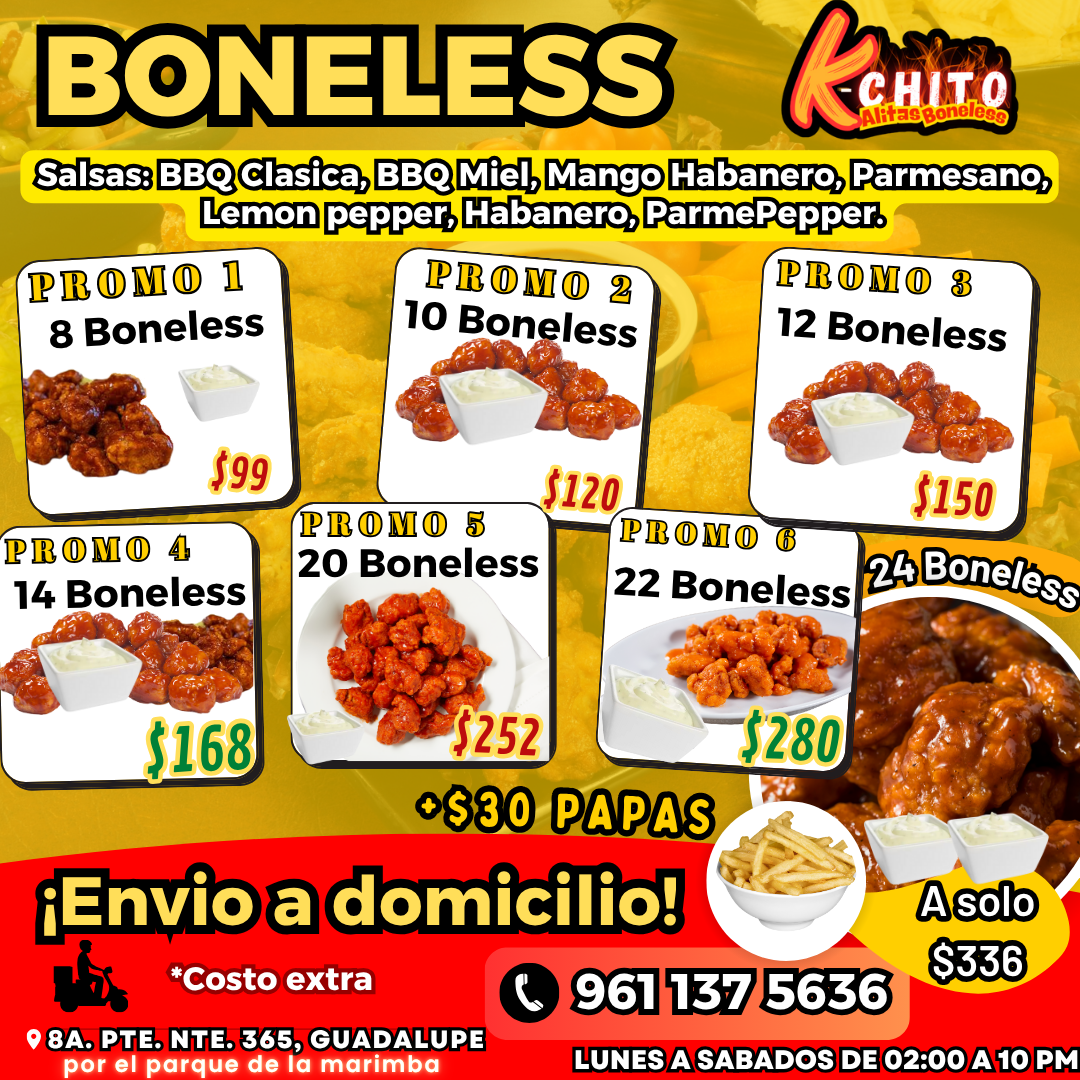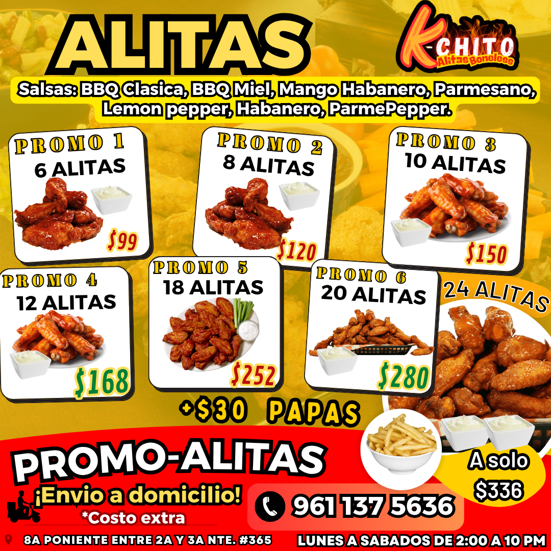 Salsas: BBQ Clasica, BBQ Miel, Mango Habanero, Parmesano, Lemon pepper, Habanero, ParmePepper.