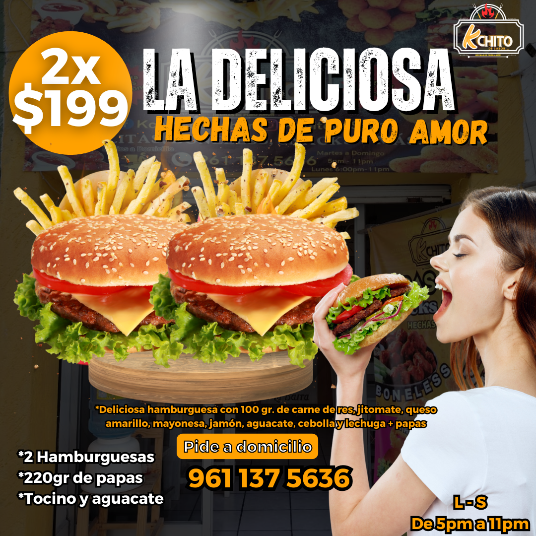 Deliciosa hamburguesa con 125gr. de carne, jitomate, queso amarillo, mayonesa, jamón, aguacate, cebolla y lechuga + papas.